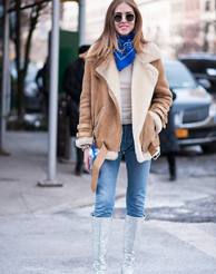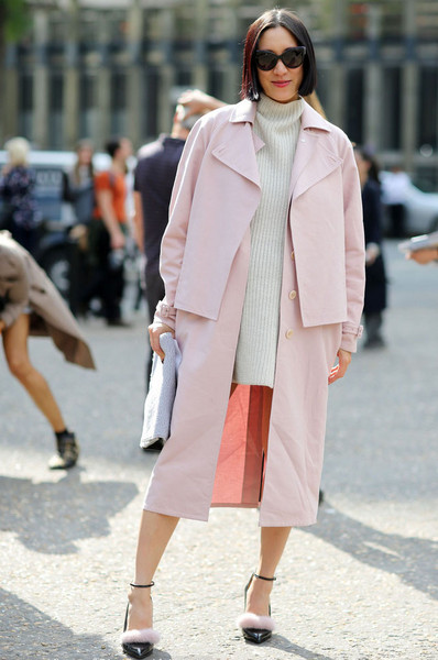Instagram時尚伙伴關(guān)系負(fù)責(zé)人Eva Chen用簡約的粉色大衣搭配白色長款高領(lǐng)針織裙,輕松制造出層次感,絨毛裝飾的尖頭高跟鞋更具玩味。